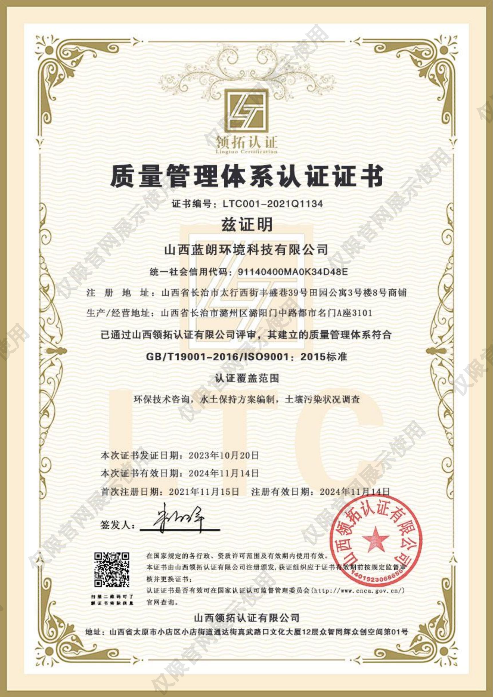 质量管理体系认证证书: